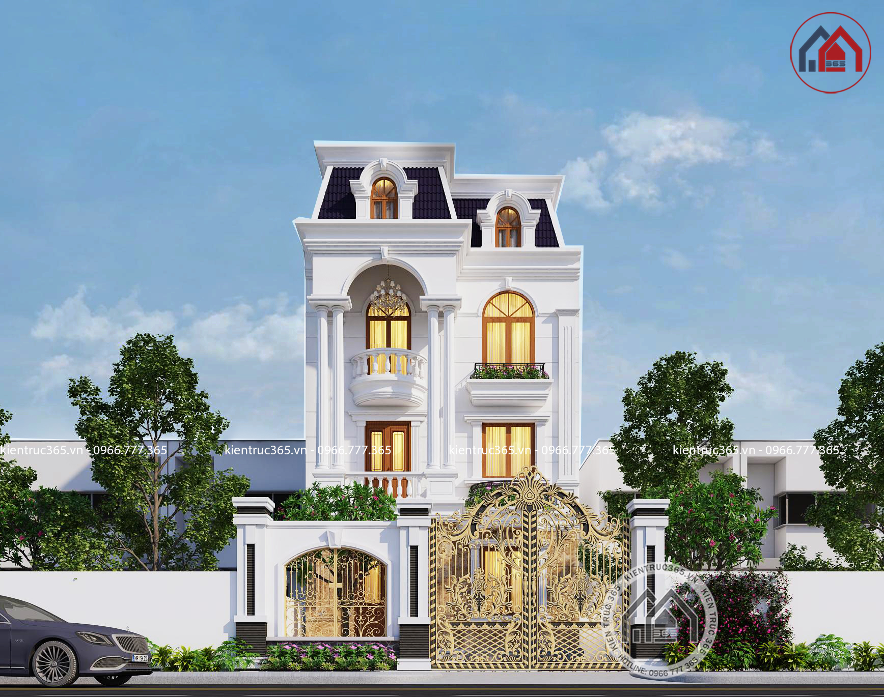 .Biệt thự lâu đài 3 tầng cổ điển được xây dựng trên một khu đất khang trang rộng lớn, nơi tâm điểm của mọi ánh nhìn để có thể khoe hết vẻ đẹp cầu kì mĩ miều của toàn bộ ngôi nhà. Toàn bộ lâu đài mang một màu trắng tinh tế làm hài lòng bất kì ai khó tính nhất, hệ thống tiền sảnh được đậm tô màu vàng quý tộc, lâu đài còn được làm đẹp bởi hệ thống mái mansard, mái vòm nhấp nhô mang lại linh hồn cho toàn bộ lâu đài. Lâu đài còn ấn tượng hơn bởi hệ thống cổng kiên cố, uy nghi, nửa mở nhằm có thể khoe nhà đẹp với bất cứ ai. Khi nhìn vào lâu đài dinh thự, chắc hẳn ai cũng muốn có cho mình một biệt thự lâu đài pháp như vậy.